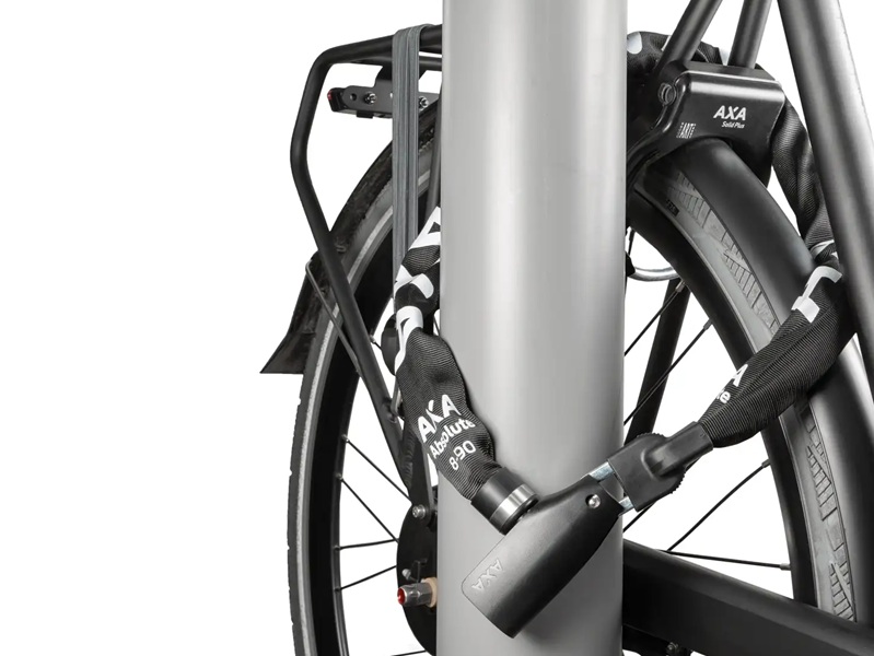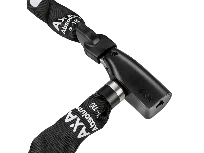 Axa Absolute 8-110 kettingslot met een lengte van 110 centimeter en een dikte van 8 millimeter. De lengte is perfect om twee fietsen aan elkaar vast te zetten of om één fiets aan een paal te zetten. Het Axa Absolute 8-110 kettingslot is gemaakt van gehard staal. Verder heeft het slot een stof omhulsel, waardoor de fiets minder beschadigt. Ook maakt het omhulsel het moeilijker om het kettingslot open te breken. Wordt geleverd met twee unieke sleutels.